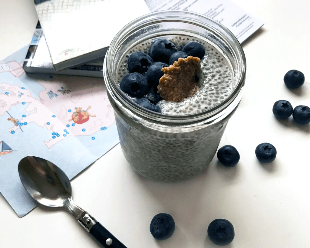 I started the day with a glass of water then moved on to have a chia pudding using almond milk, blueberries, and almond butter. You can do this recipe the night before and just get it out of the fridge first thing in the morning.